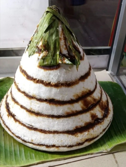 Kue ini biasanya disajikan di atas daun pisang dan ditaburi parutan buah kelapa.