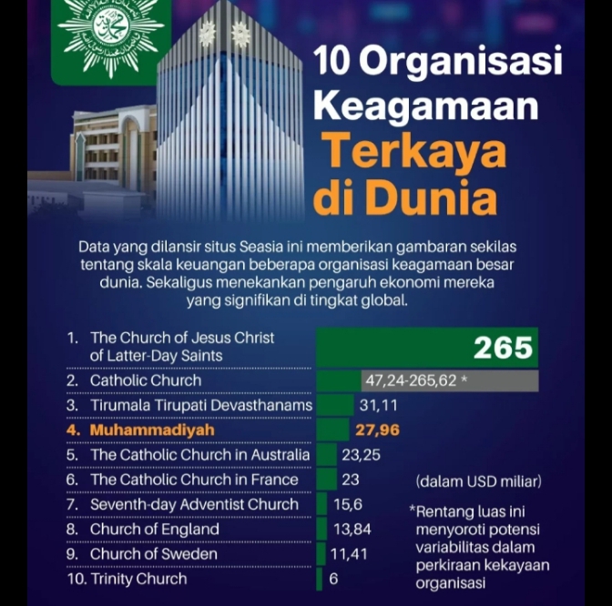 Berdasarkan kompilasi data terkini yang dikutip dari Seasia Stats , terdapat sepuluh organisasi keagamaan dengan kekayaan terbesar di dunia.