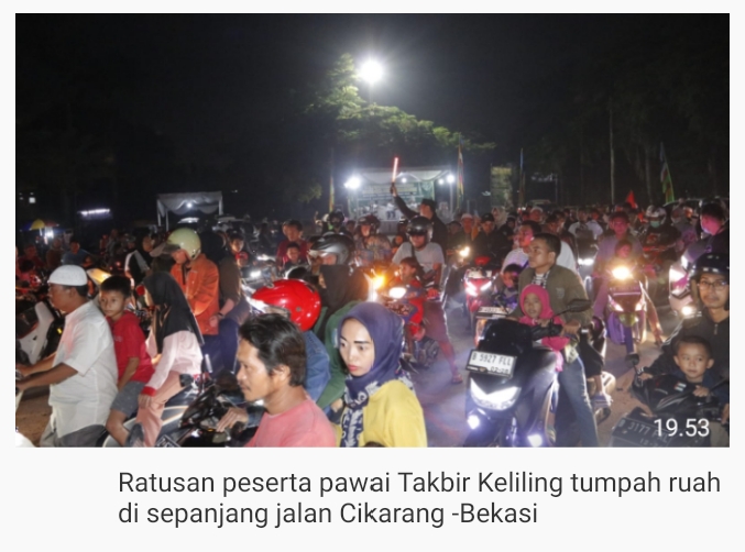 JurnalBudaya.Com- Lagi, pawai Takbir Keliling Idul Fitri untuk ke-36 diadakan di Cikarang, Kabupaten Bekasi, Selasa ( 09/04) malam , diikuti sekitar 300-an peserta mengendarai sepeda motor dan puluhan lainnya dengan kendaraan roda empat.