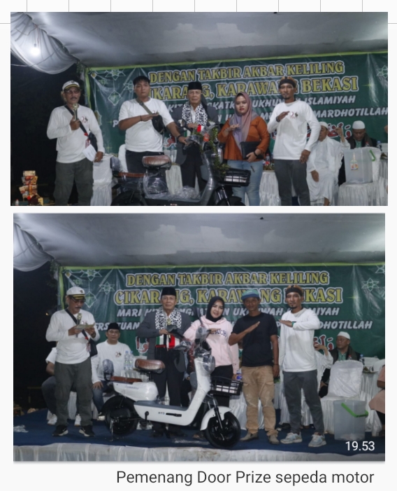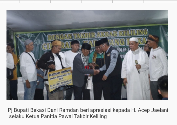 Usai memberikan hadiah umroh tersebut, Pejabat Pj Bupati Bekasi Dani Ramdan menyampaikan penghargaannya kepada panitia Pawai Takbir Keliling yang telah melaksanakan kegiatan ini dengan sukses, aman, lancar dan tertib.